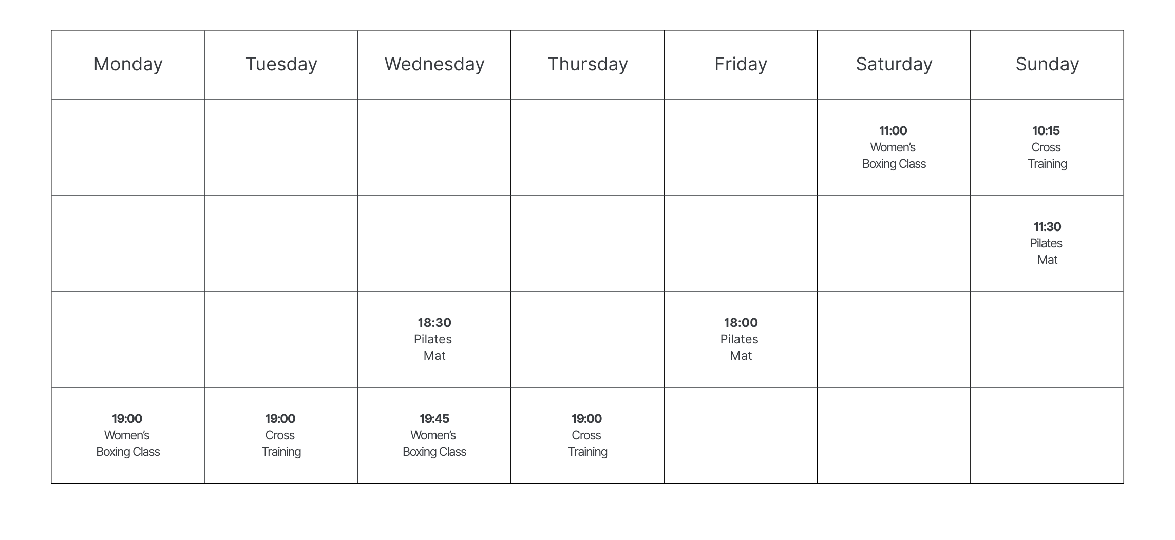 No specific equipment or prior experience is required to participate in our Cross Training, Women’s Boxing, or Pilates, classes. For boxing trial sessions, gloves are provided. Participants must simply be 18 years of age or older.